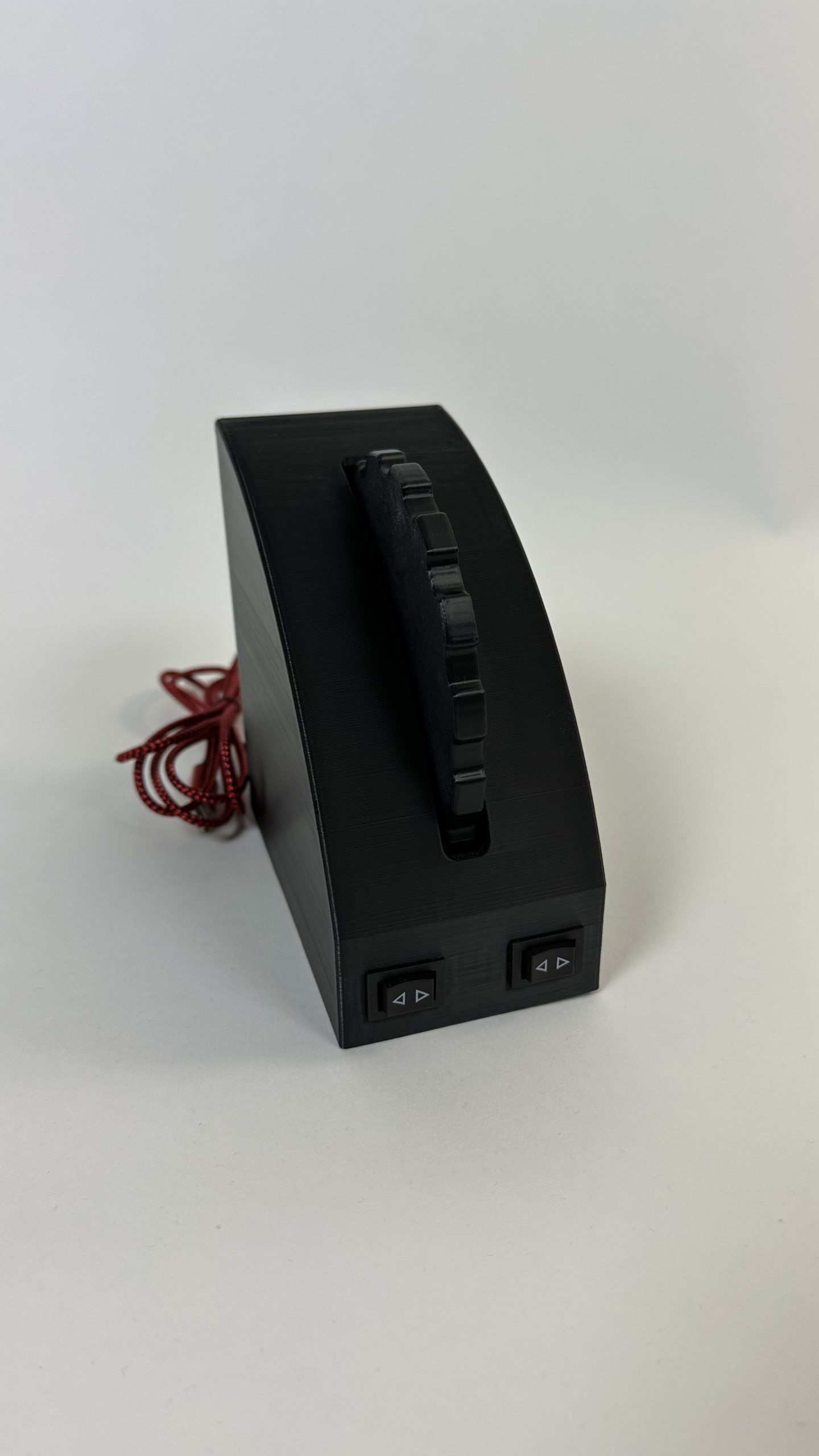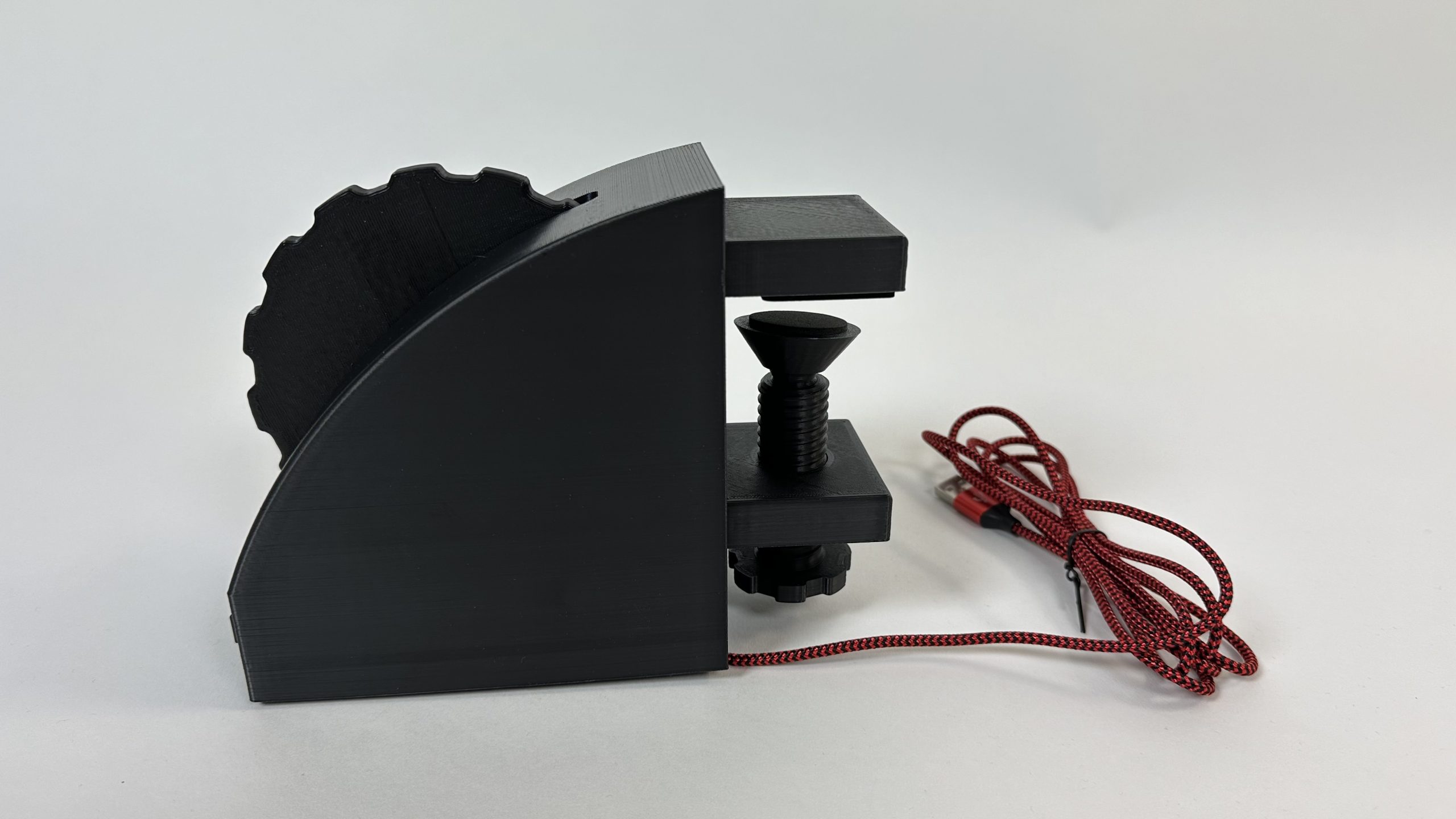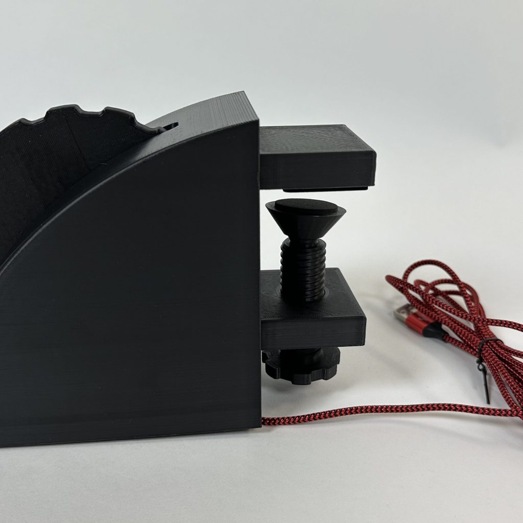 Das Trimmrad wird mit einer Montagehalterung geliefert. Mit Hilfe der Schraubbefestigung lässt sich das Gerät sicher befestigen. Dadurch ist eine Montage sowohl am heimischen „Schreibtisch-Setup“, als auch die Installation in einem profesionellen Flugsimulator möglich.